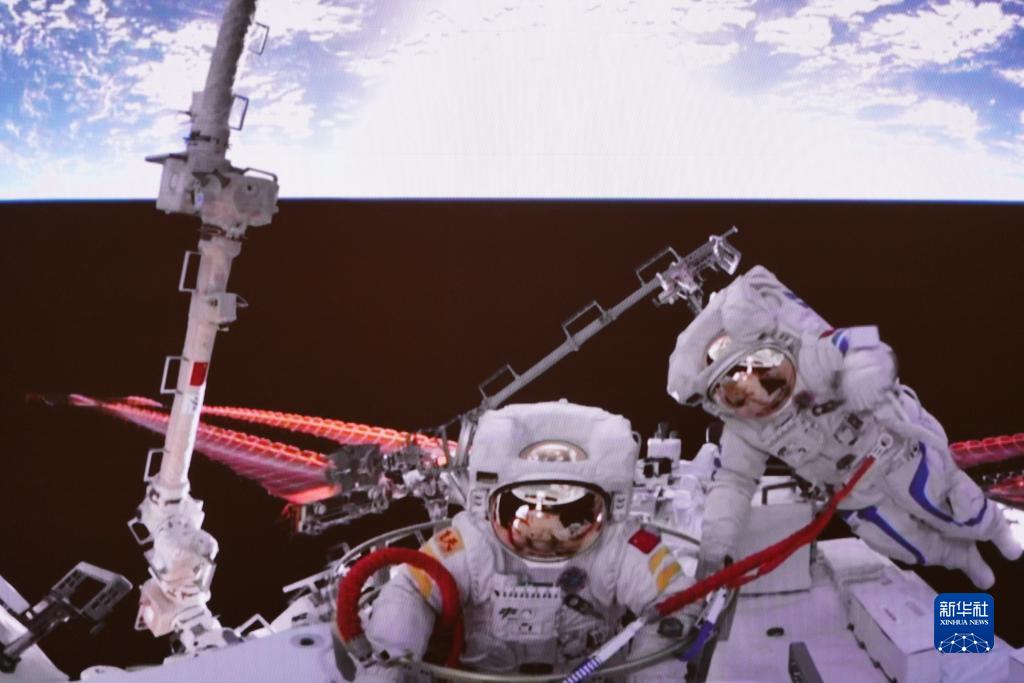 9月2日在北京航天飛行控制中心拍攝的神舟十四號航天員劉洋(左)結束出艙任務(wù)正在返回的畫(huà)面。