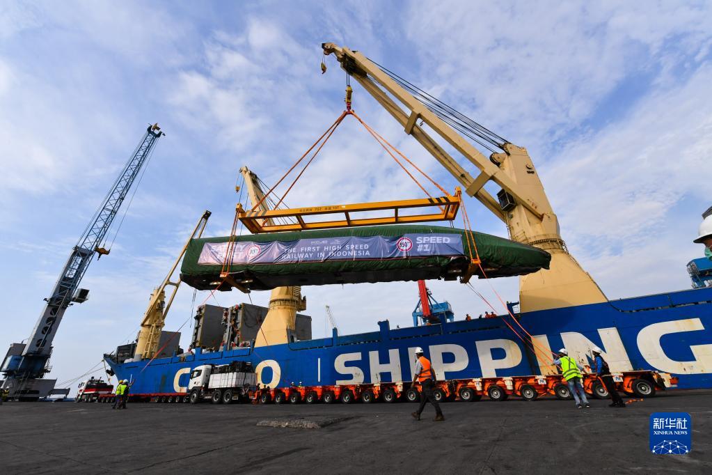 9月2日,在印度尼西亞雅加達丹戎不碌港舉行的運抵儀式上,雅萬(wàn)高鐵高速動(dòng)車(chē)組在港口卸船。