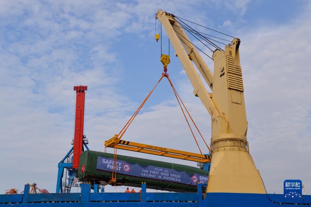 9月2日,在印度尼西亞雅加達丹戎不碌港舉行的運抵儀式上,雅萬(wàn)高鐵高速動(dòng)車(chē)組在港口卸船。