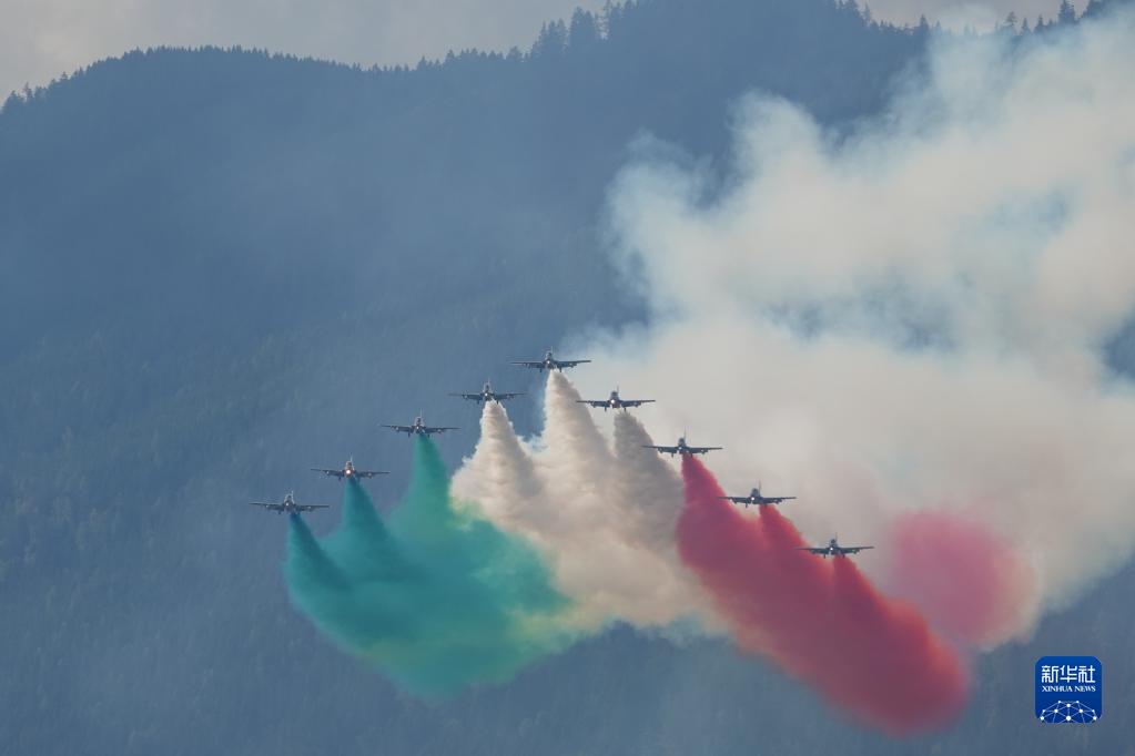 9月2日,意大利“三色箭”飛行表演隊在奧地利“空中力量-2022”航展上表演。