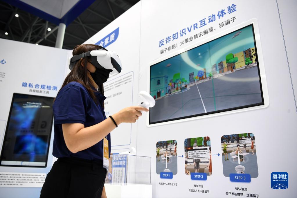 9月4日,一家參展企業(yè)代表在演示反詐知識VR互動(dòng)體驗項目。