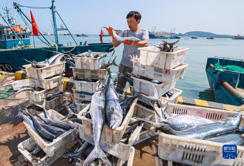 9月6日,在山東省榮成市好運角旅游度假區龍眼港碼頭,漁民分揀、裝運各類(lèi)漁獲。