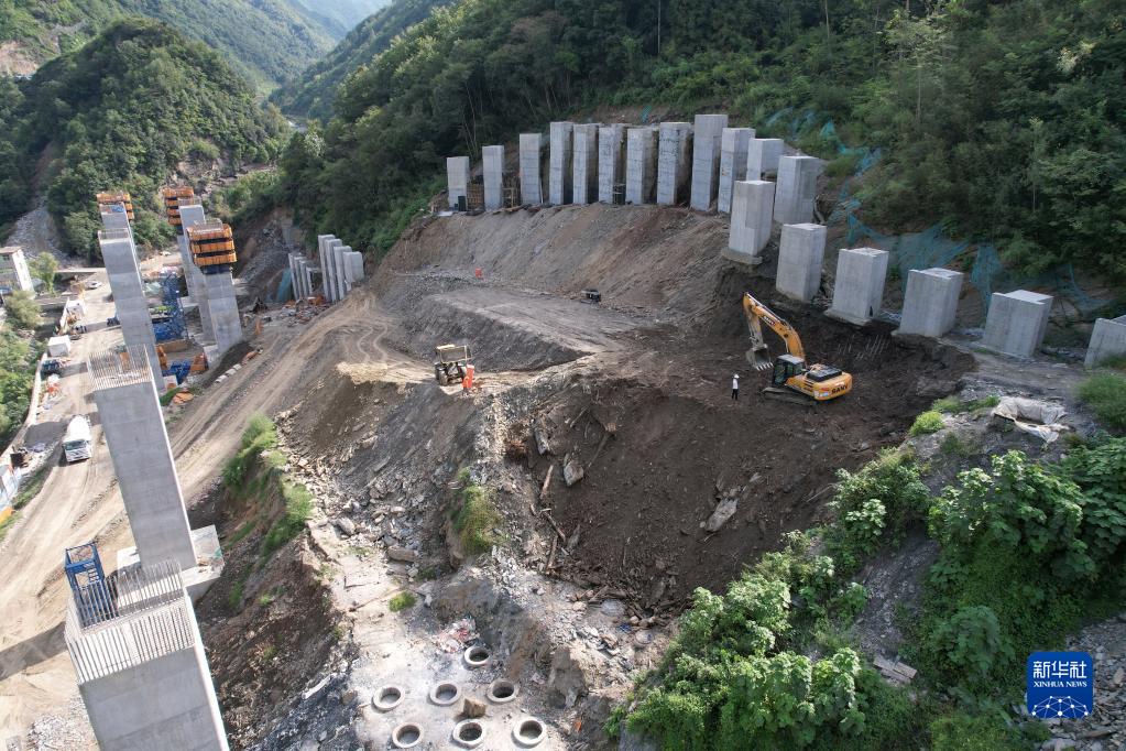 建設中的西康高鐵桐木車(chē)站特大橋(9月6日攝,無(wú)人機照片)。