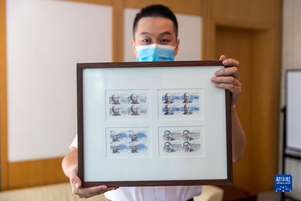 9月7日,工作人員在中國科學(xué)院上海分院展示《中國現代科學(xué)家(九)》紀念郵票。