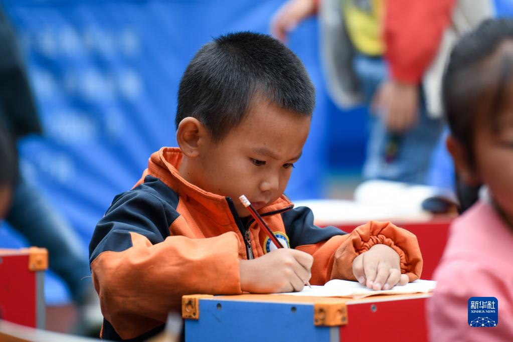 9月7日,學(xué)生在石棉縣草科鄉中心小學(xué)操場(chǎng)上做作業(yè)。