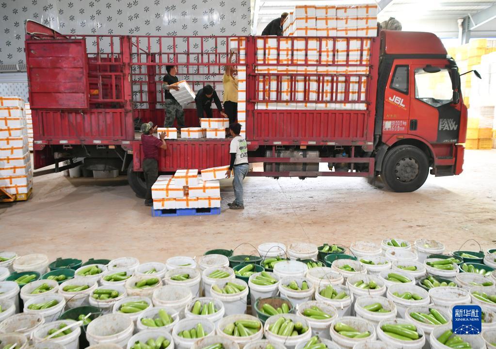 9月5日,工作人員在位于麟游縣九成宮鎮西坊村的農業(yè)示范園將蔬菜裝車(chē)。