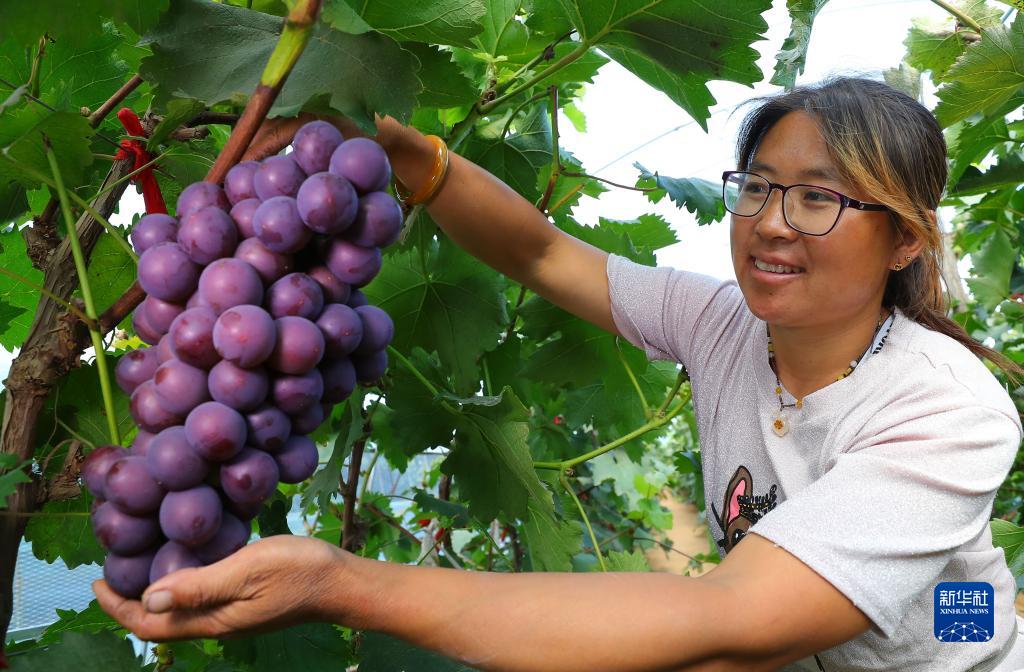 9月6日,在丁家房鎮大蛇山子村,果農在大棚里查看葡萄成熟情況。