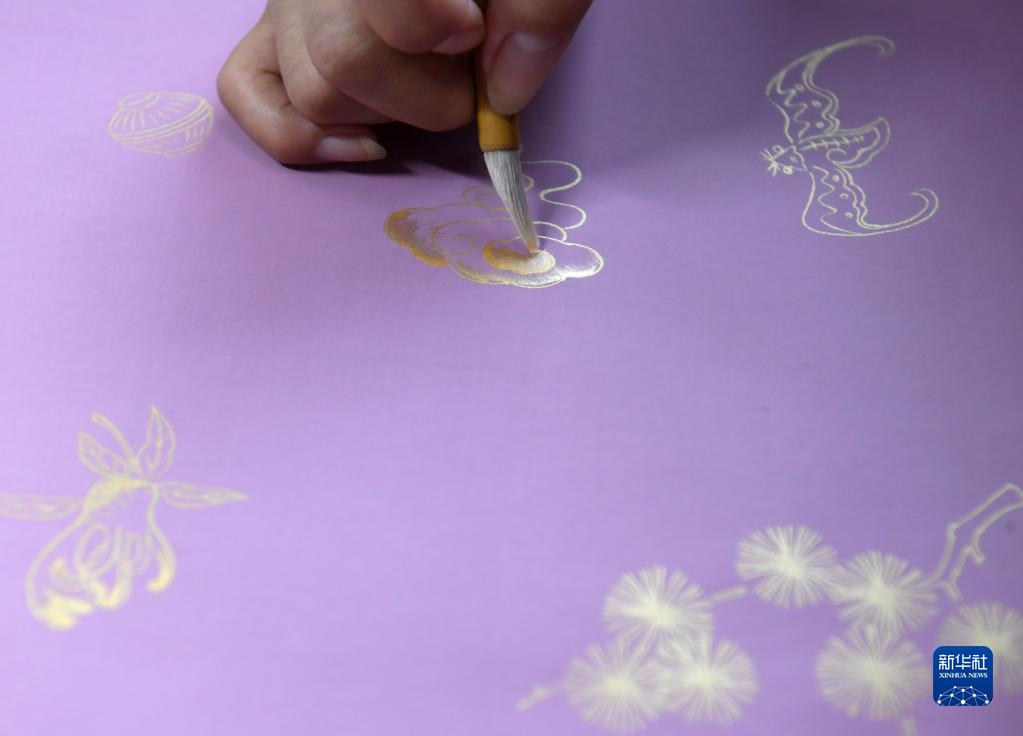 9月8日,紙箋加工技藝傳習基地的工人在粉蠟箋上進(jìn)行描金。