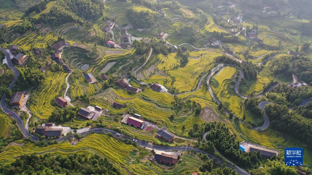 在中國農民豐收節即將到來(lái)之際,“世界灌溉工程遺產(chǎn)”“全球重要農業(yè)文化遺產(chǎn)”湖南省婁底市新化縣水車(chē)鎮紫鵲界梯田種植的水稻陸續進(jìn)入成熟期,田野一片金黃,農民利用晴好天氣搶收搶割。