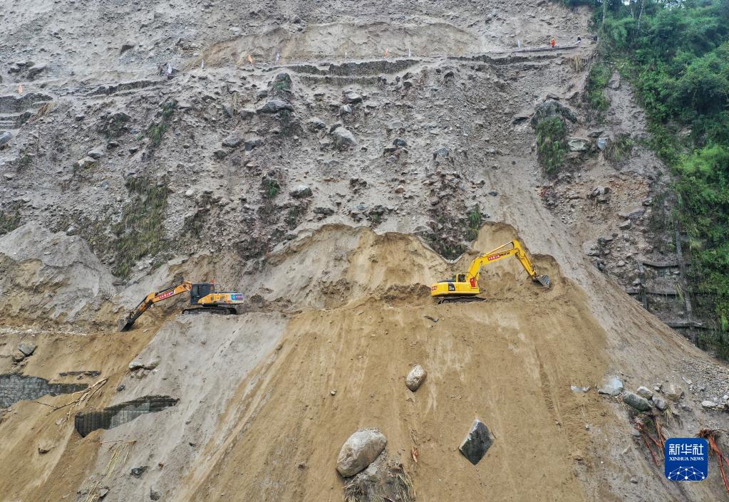 9月9日,搶險人員在搶通磨西鎮附近道路(無(wú)人機照片)。