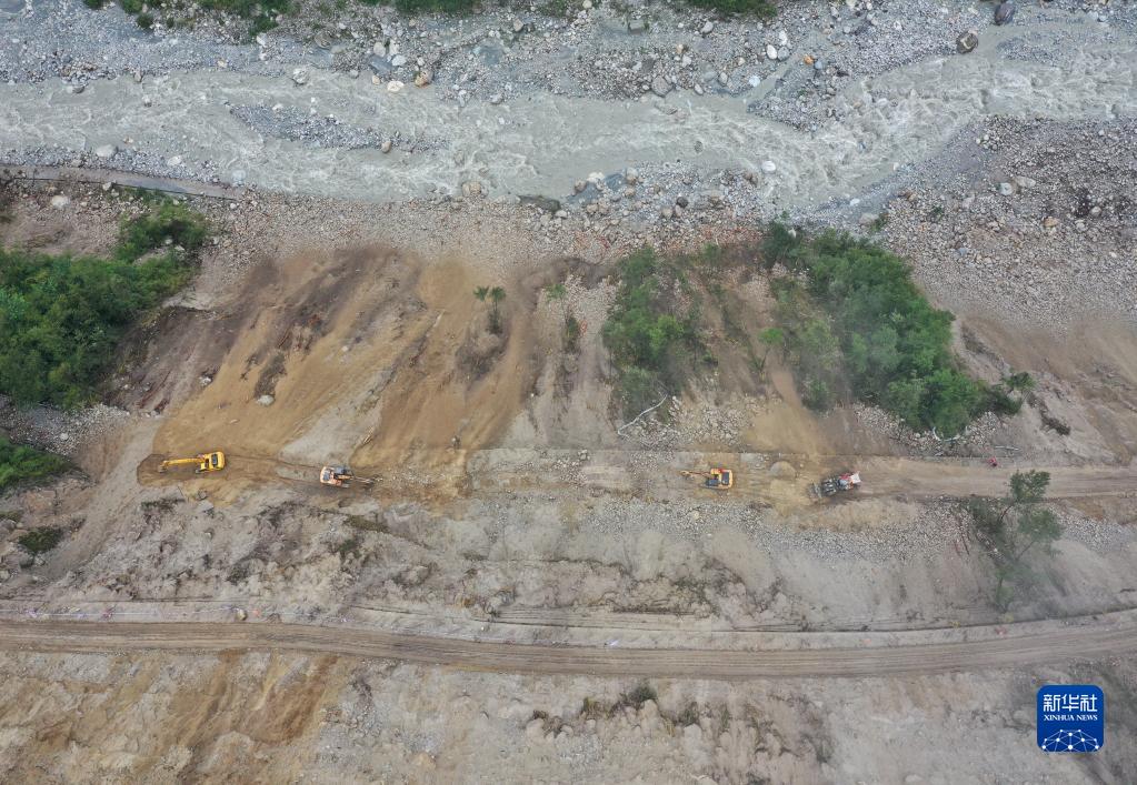 9月9日,搶險人員在搶通磨西鎮附近道路(無(wú)人機照片)。