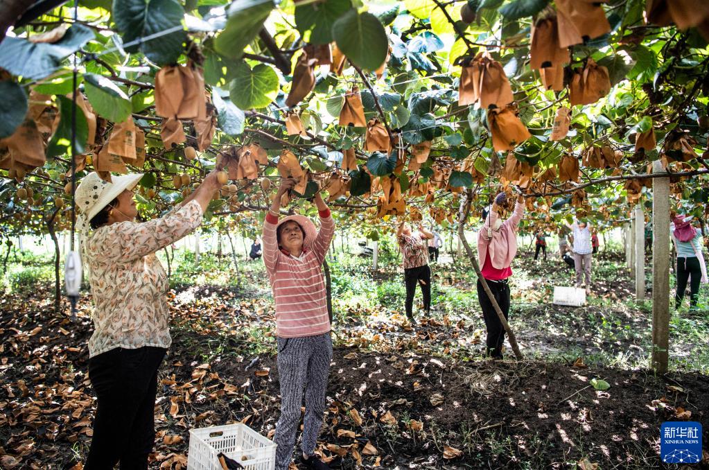 9月9日,當地村民在陜西齊峰果業(yè)城固基地為獼猴桃摘除套袋,讓獼猴桃接受光照。