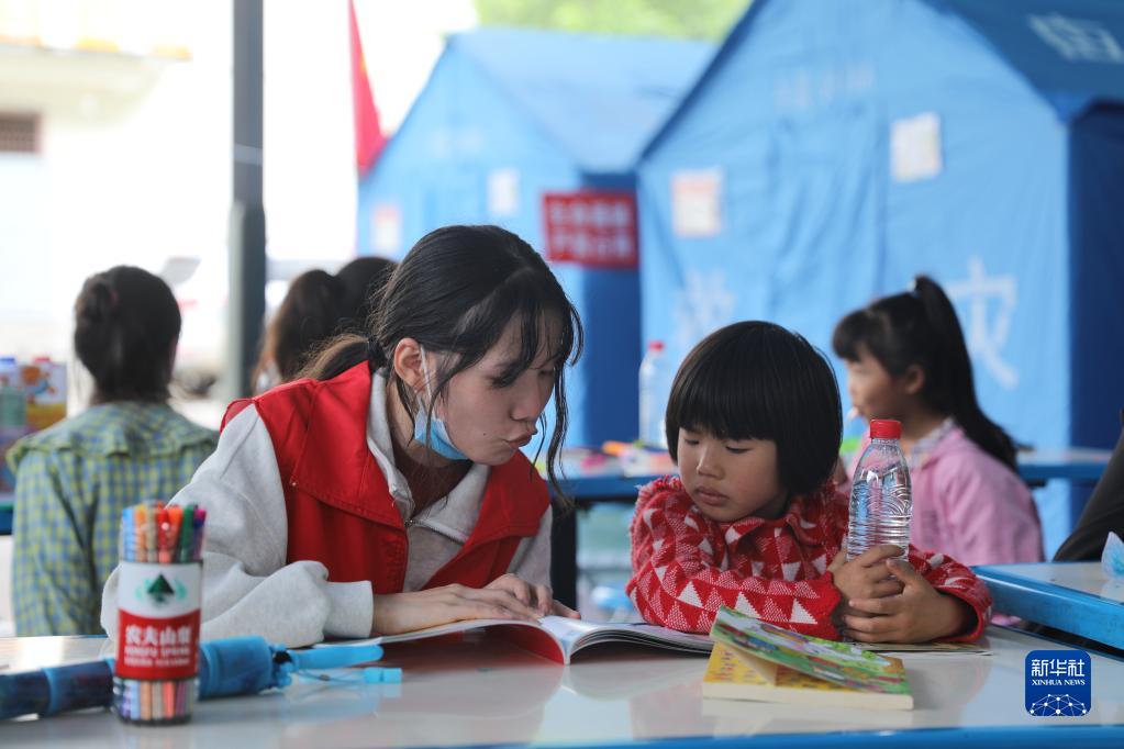 四川省甘孜州瀘定縣6.8級地震發(fā)生后,在雅安市石棉縣的臨時(shí)安置點(diǎn)里,老師和志愿者帶領(lǐng)孩子們學(xué)習、畫(huà)畫(huà)、做游戲,在這個(gè)特殊時(shí)期安撫和陪伴他們。