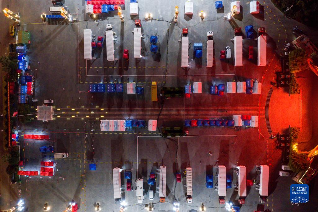 9月9日晚拍攝的貴陽(yáng)市筑城廣場(chǎng)移動(dòng)方艙核酸檢測基地(無(wú)人機照片)。