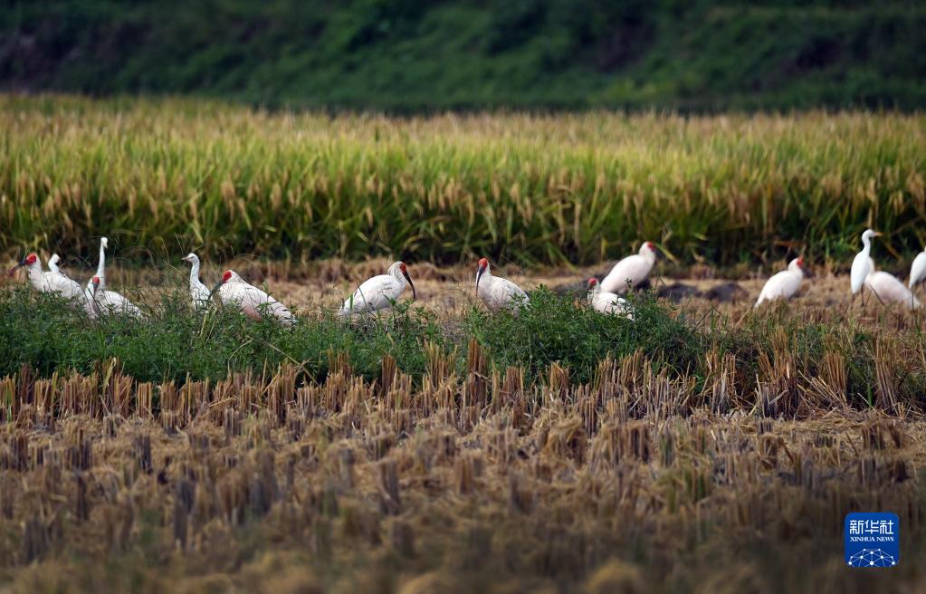 9月10日,朱鹮和白鷺在洋縣紙坊街道周家坎村稻田里停歇。