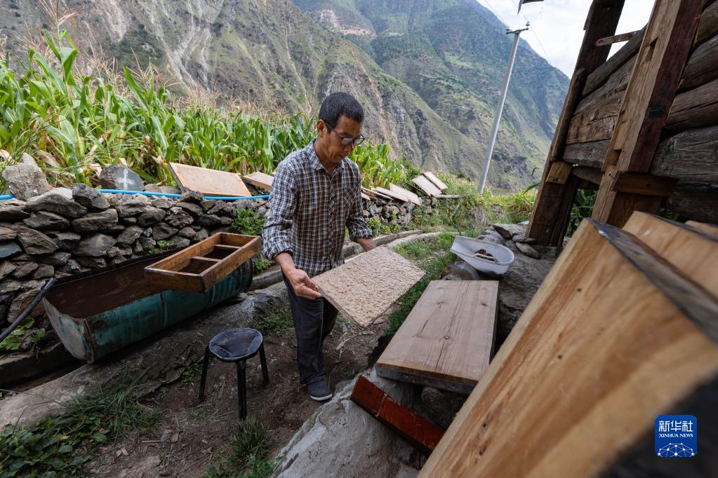 生活在四川省木里藏族自治縣納西族古村寨俄亞大村的英扎次里,是東巴文化省級非遺傳承人。通過(guò)不斷研究摸索,他逐漸掌握納西東巴古法造紙技藝。