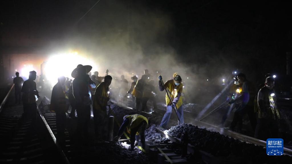 工人在柳州太陽(yáng)村站進(jìn)行夜間換岔施工(9月10日攝)。