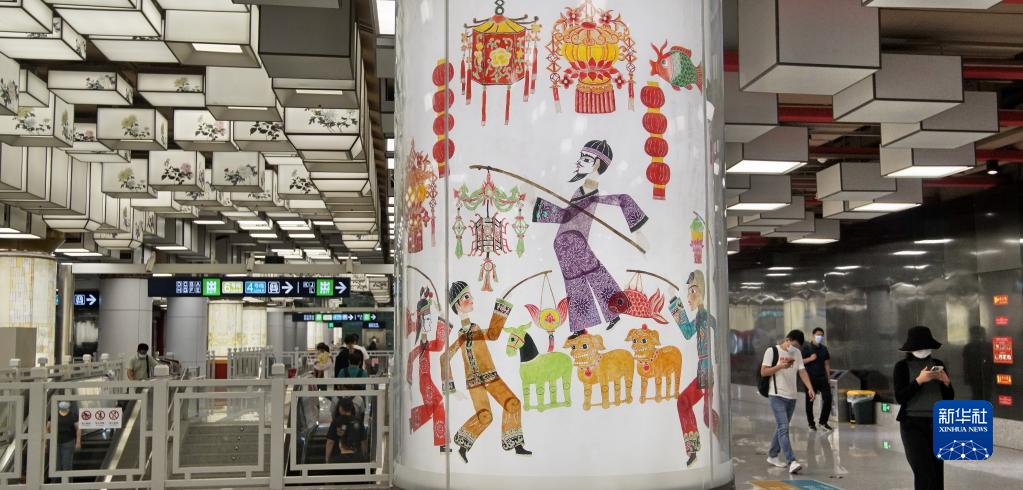 北京地鐵19號線(xiàn)平安里站內能夠旋轉的皮影燈柱(9月9日攝)。