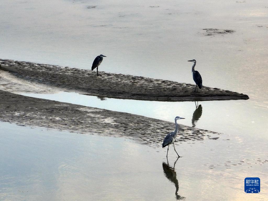 9月10日,水鳥(niǎo)在武漢天興洲裸露灘涂停留(無(wú)人機照片)。