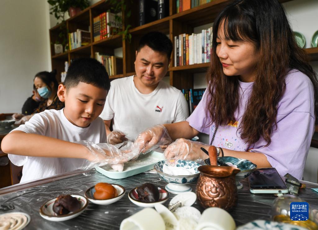 9月10日,小朋友和家長(cháng)在重慶龍門(mén)浩老街學(xué)習、體驗月餅制作。