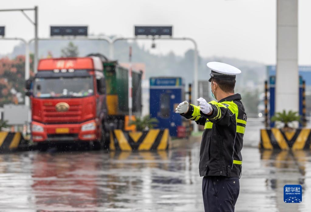 9月10日,交警在貴州黔西市坪子收費站冒雨指揮交通。
