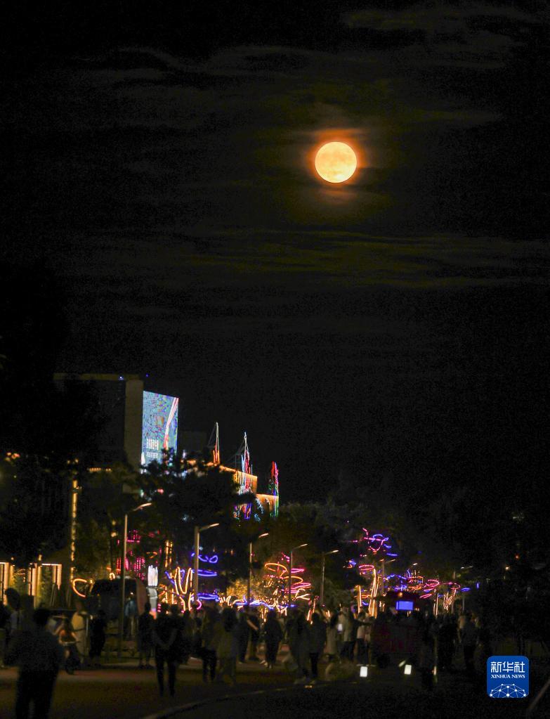 9月10日,市民在山東省榮成市櫻花湖體育公園賞月。