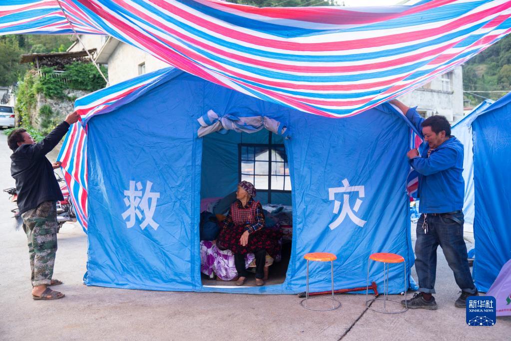 9月10日,在四川省石棉縣王崗坪彝族藏族鄉幸福村,村民為一名老人的帳篷加蓋防雨布。