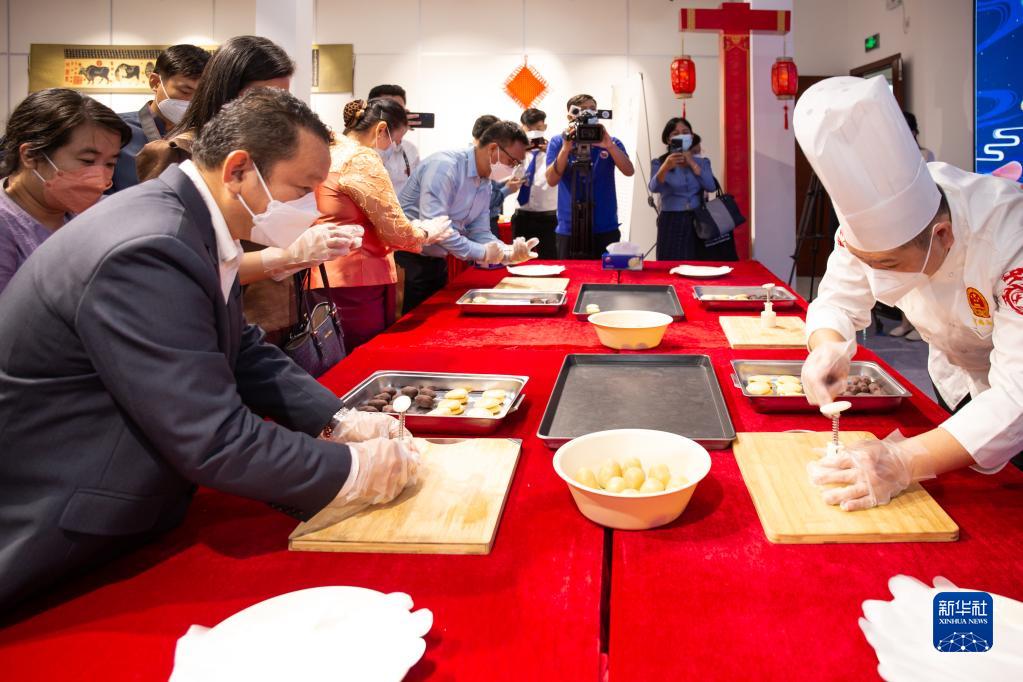 9月9日,人們在位于老撾首都萬(wàn)象的老撾中國文化中心學(xué)做月餅。