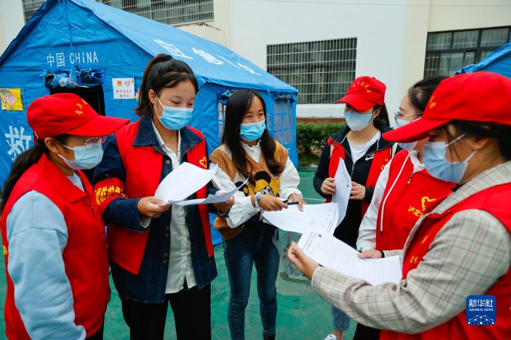 9月10日,在四川省甘孜州瀘定縣第二中學(xué)校地震災后臨時(shí)安置點(diǎn),羅蓮(左三)與其他志愿者老師商議當天“帳篷課堂”的內容。