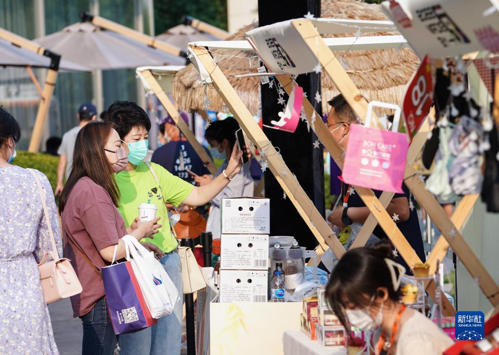 9月11日,人們在北京朝陽(yáng)區亮馬河畔的“中秋市集”上購物休閑。新華社記者 陳鐘昊 攝