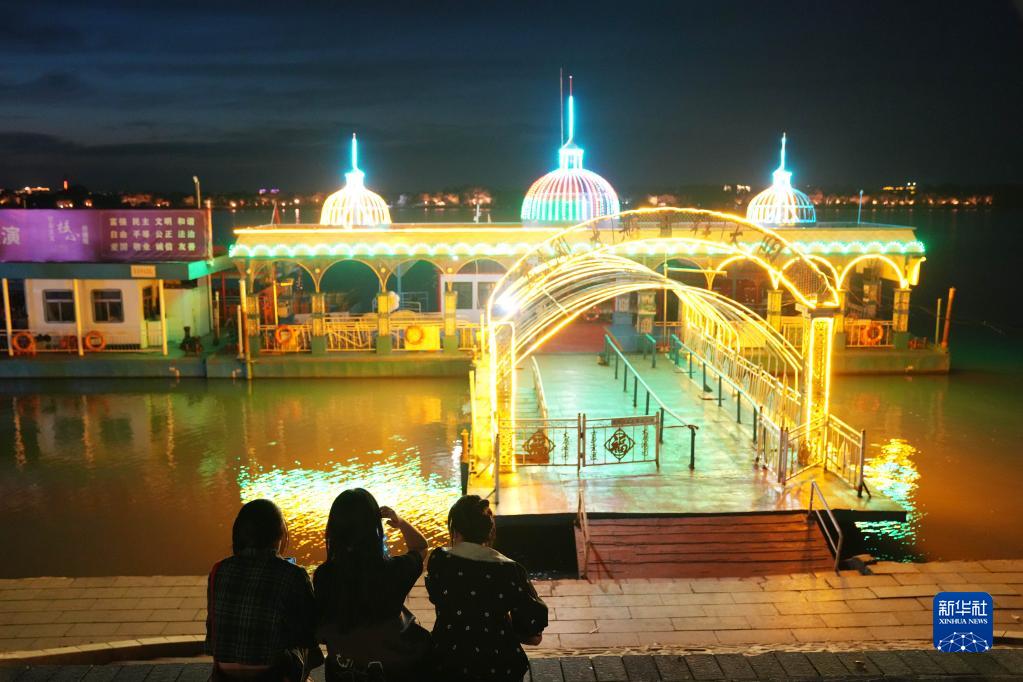 中秋假日,冰城哈爾濱市的松花江畔夜色迷人,吸引市民前來(lái)賞景游玩。