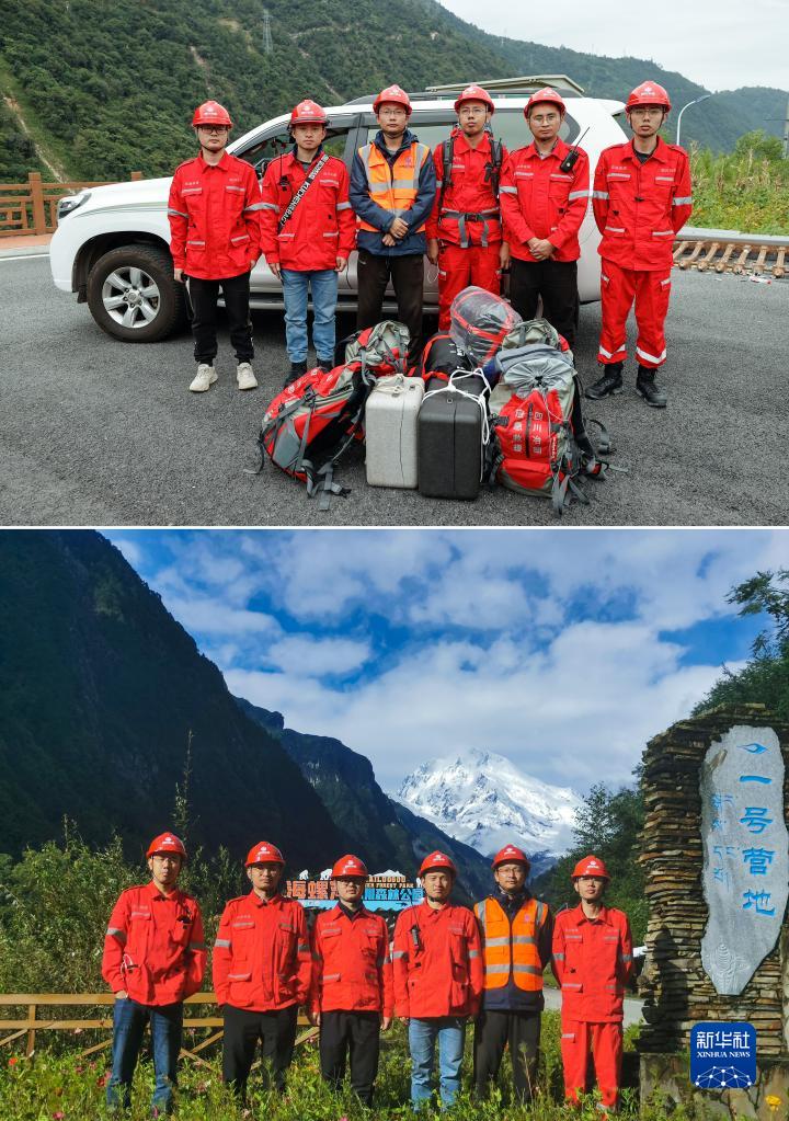 這是一張拼版照片,上圖為:9月7日,四川省冶勘設計集團有限公司的6名調查隊員在搭乘直升機去往海螺溝前拍攝的合影(新華社記者沈伯韓攝);下圖為:9月10日,6名調查隊員在海螺溝景區一號營(yíng)地拍攝的合影(四川省冶勘設計集團有限公司供圖)。