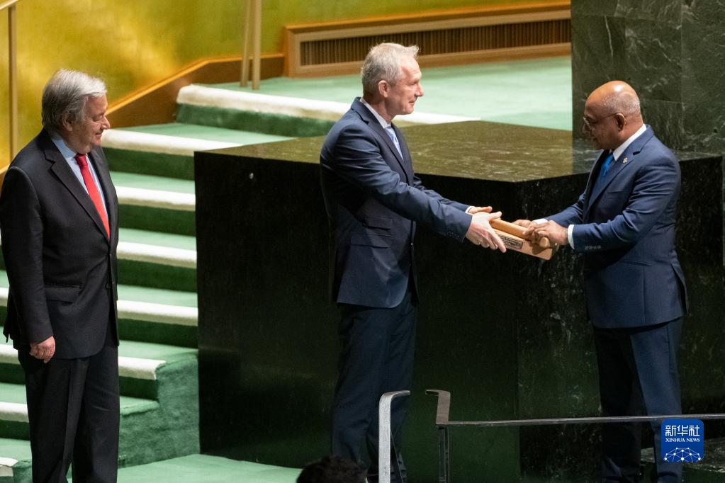 9月12日,在位于紐約的聯(lián)合國總部,第77屆聯(lián)合國大會(huì )主席克勒希(中)從上屆聯(lián)大主席沙希德(右)手中接過(guò)象征聯(lián)大主席權力的木槌。