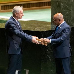 第76屆聯(lián)合國大會(huì )12日舉行閉幕會(huì )。第76屆聯(lián)大主席沙希德致辭,匈牙利外交官克勒希宣誓就任第77屆聯(lián)大主席,從沙希德手中接過(guò)聯(lián)大議事槌。聯(lián)合國秘書(shū)長(cháng)古特雷斯稱(chēng)贊沙希德的遠見(jiàn)和領(lǐng)導才能,期待與克勒希合作。