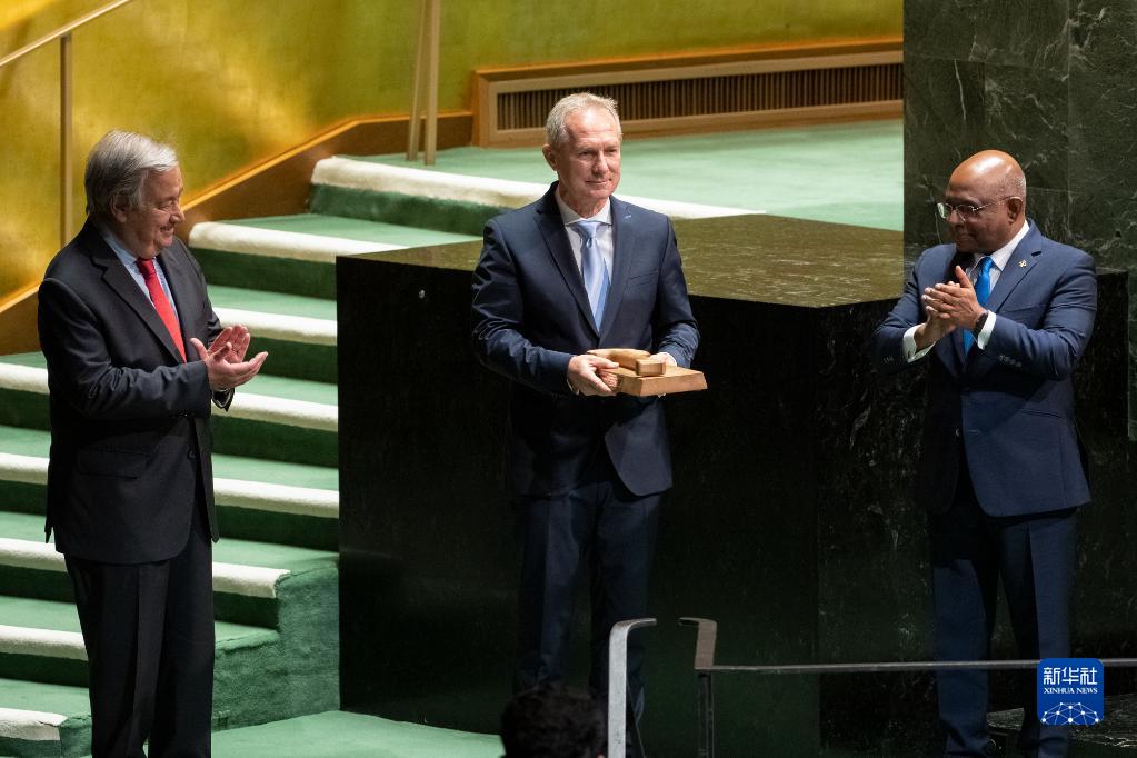 9月12日,在位于紐約的聯(lián)合國總部,第77屆聯(lián)合國大會(huì )主席克勒希(中)從上屆聯(lián)大主席沙希德(右)手中接過(guò)象征聯(lián)大主席權力的木槌。