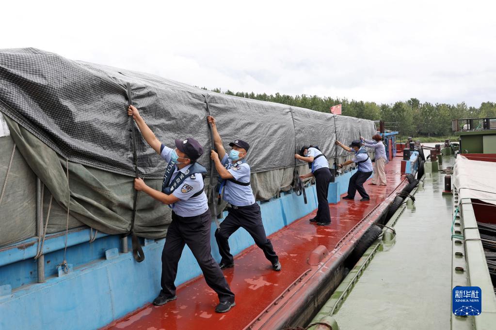 9月14日,江蘇省寶應縣公安局水上派出所民警幫助船民加固收緊船上的運輸物資。