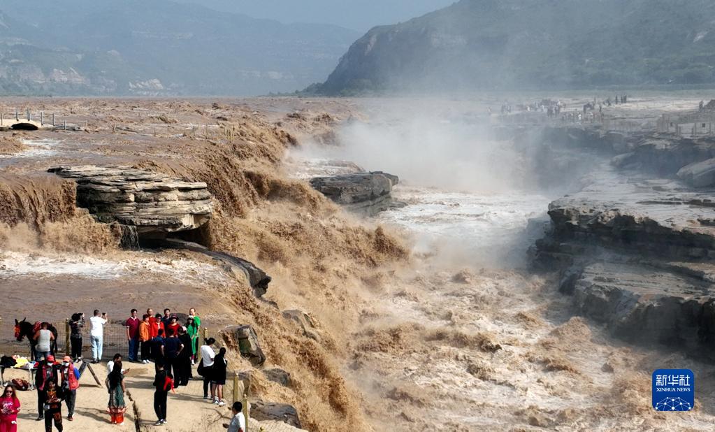 9月15日,游人在黃河壺口瀑布游覽(無(wú)人機照片)。