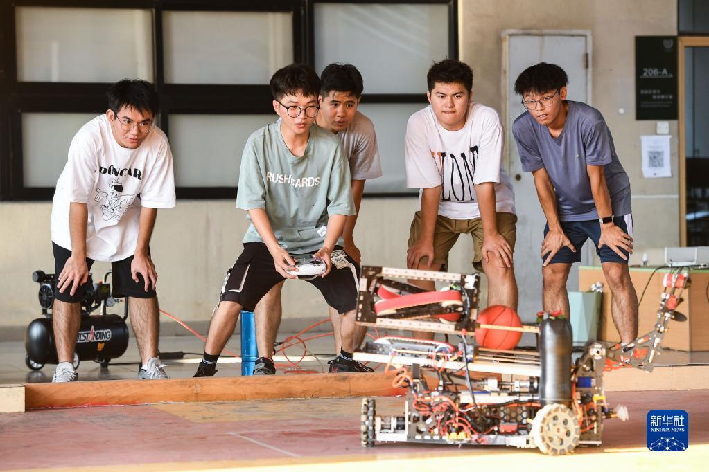 廣東工業(yè)大學(xué)粵港機器人聯(lián)合學(xué)院的學(xué)生在“工大創(chuàng )谷”進(jìn)行機器人研發(fā)(9月14日攝)。