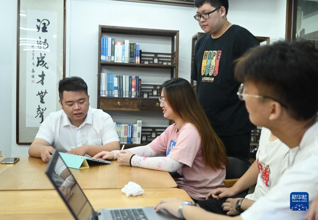 9月16日,林俊杰(左一)在福州外語(yǔ)外貿學(xué)院與大學(xué)生創(chuàng )新創(chuàng )業(yè)團隊成員討論公司新創(chuàng )的“胖小俊”IP人物和品牌塑造方案。