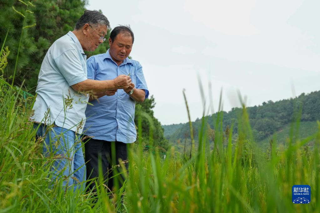 趙亞夫(左)在江蘇省句容市天王鎮戴莊村查看水稻長(cháng)勢(2022年9月9日攝)。