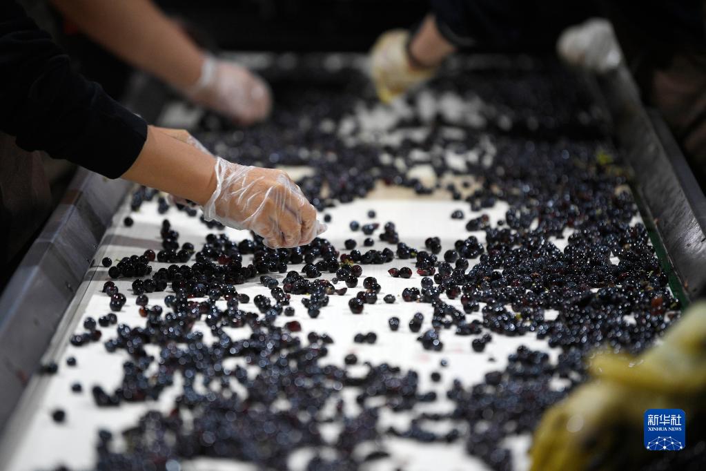 9月16日,工人在寧夏銀川市賀蘭山東麓的沃爾豐酒莊清洗、分揀釀酒葡萄。