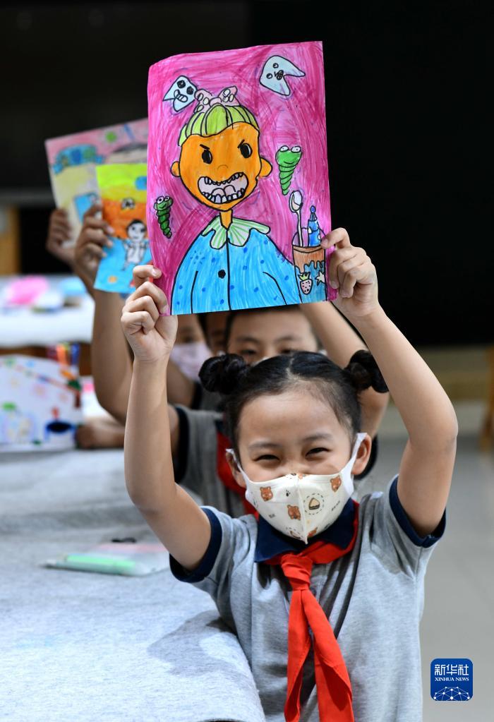 9月19日,在河北省石家莊市西古城小學(xué),孩子們在展示迎接愛(ài)牙日主題繪畫(huà)作品。