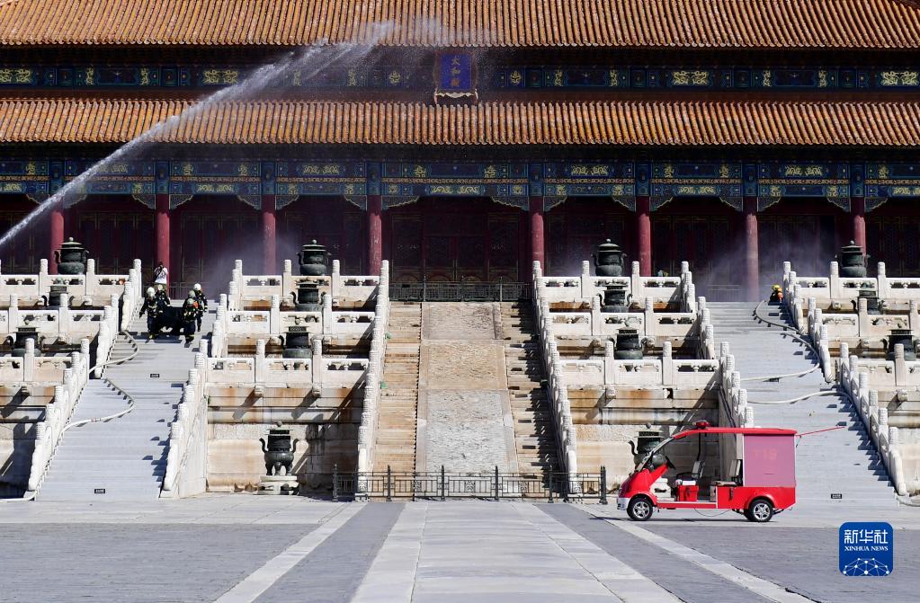 9月19日在故宮太和殿前拍攝的文物古建筑消防救援綜合實(shí)戰演練現場(chǎng)。