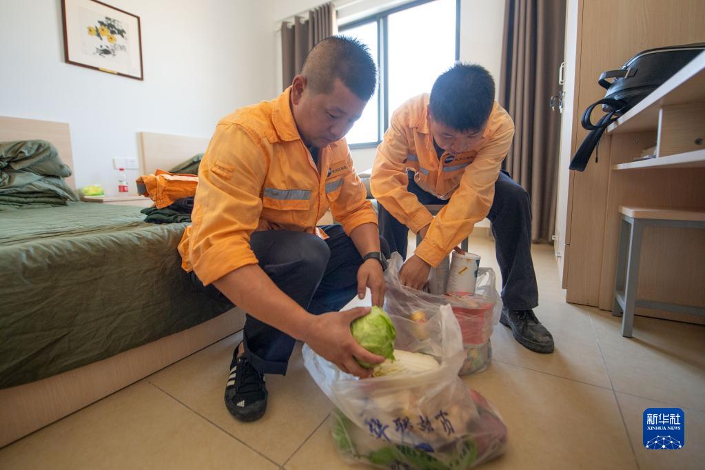 9月19日,看守員趙偉燈(左)與蔡金礦在寢室內準備值守期間的各類(lèi)生活物資。