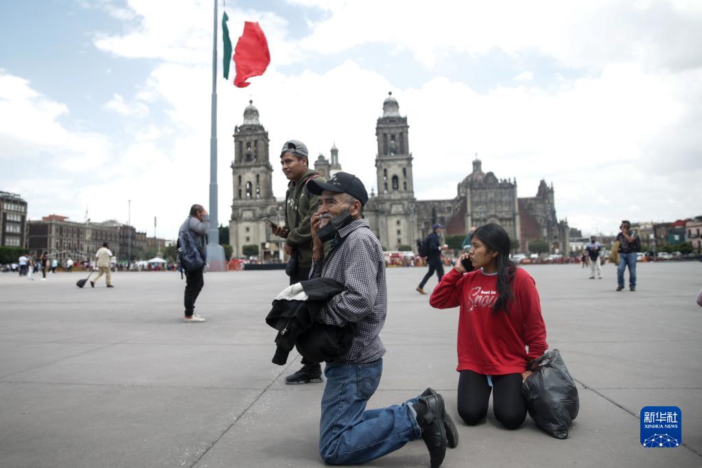 9月19日,在墨西哥首都墨西哥城,室外避險的人們打電話(huà)通報消息。