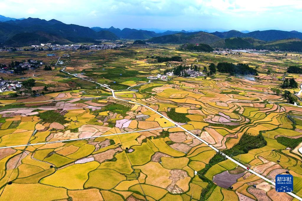 貴州省龍里縣灣灘河鎮的水稻陸續成熟,田園一派豐收景象(9月17日攝,無(wú)人機照片)。