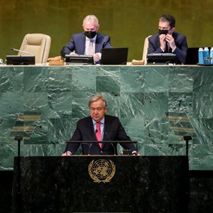 9月20日,在位于紐約的聯(lián)合國總部,聯(lián)合國秘書(shū)長(cháng)古特雷斯(下)在聯(lián)合國大會(huì )一般性辯論開(kāi)幕式上講話(huà)。
