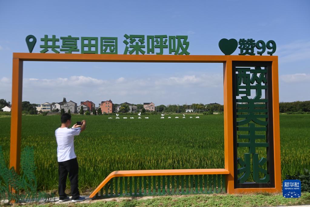 9月20日,織里鎮陸家灣村村民在稻田旁拍攝美景。