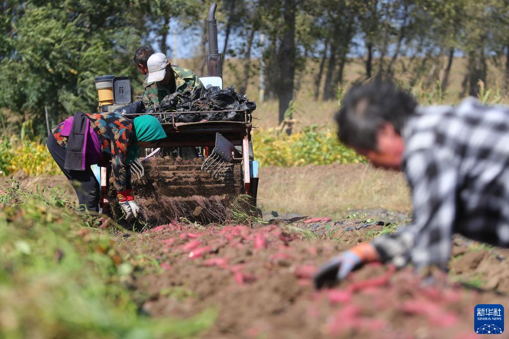 9月21日,在康平縣方家屯鎮十家子村,農民在地里收獲紅薯。