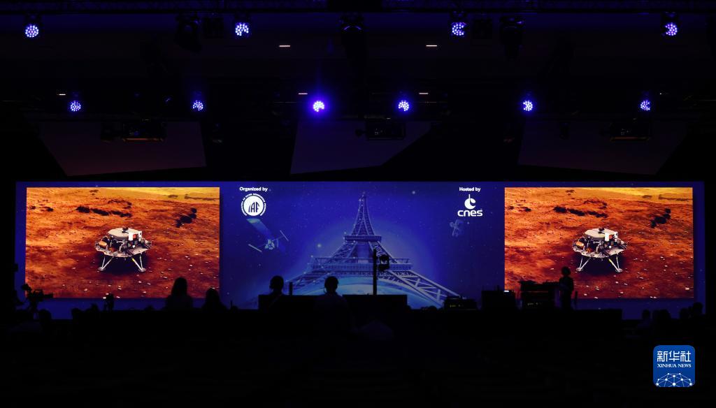 這是9月21日在法國巴黎拍攝的天問(wèn)一號火星探測團隊成果介紹會(huì )現場(chǎng)。